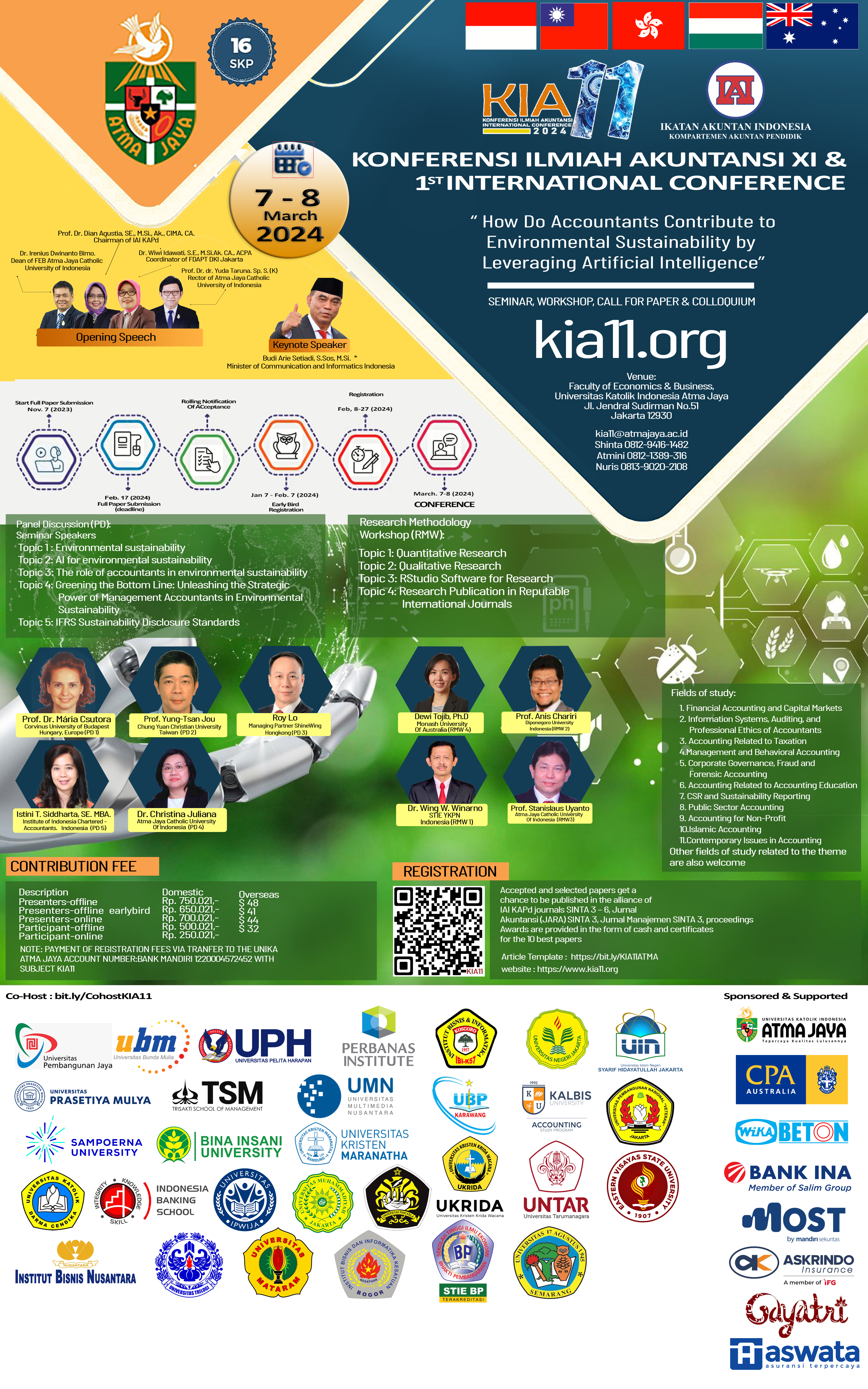 Welcome to the 11th Konferensi Ilmiah Akuntansi (KIA) and the 1st International Conference. This website provides detailed information about the event, scheduled for March 7th and 8th, 2024, at the Atma Jaya Catholic University of Indonesia in Jakarta. This conference continues the tradition of the annual KIA events, organized collaboratively by host and co-host universities in the Jakarta-Bogor-Bekasi area, in conjunction with IAI KAPd..